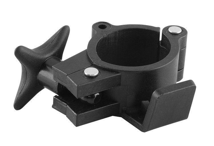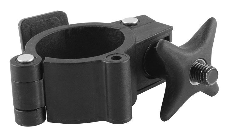 The Scrim Clamp allows you to attach the top of a tripod scrim securely and safely to the upright pole of any tripod stand. The Scrim Clamp eliminates the need for zip-ties or other less than optimum attachment methods for a clean, secure, professional look. Made of high impact plastic, steel hinge pins, and steel tension bolt. The Scrim Clamp hinges open to allow attachment or removal from a tripod upright pole at any time. The clamp fits any tripod stand from 1 3/8 in. up to 1 1/2 in. (35-38 mm) in diameter. The clamp hook allows any tripod scrim with a top loop to be attached in seconds.