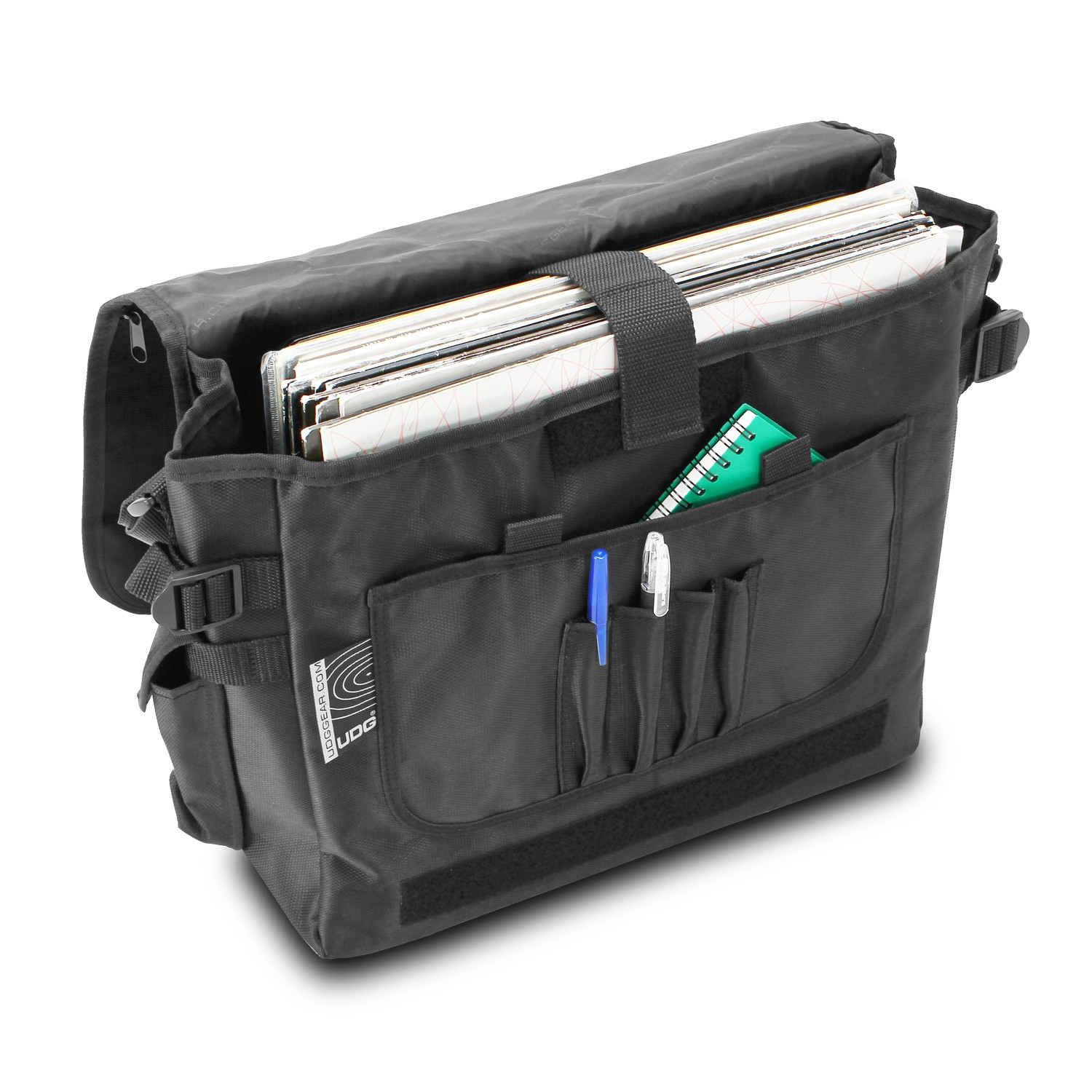 The CourierBag holds approximately 40 records or 1 Audio Interface + cables. It is a perfect bag for those who like to travel light. In the front flap, you can store paperwork and other important documents. The back side has a small zipper pocket for personal accessories.