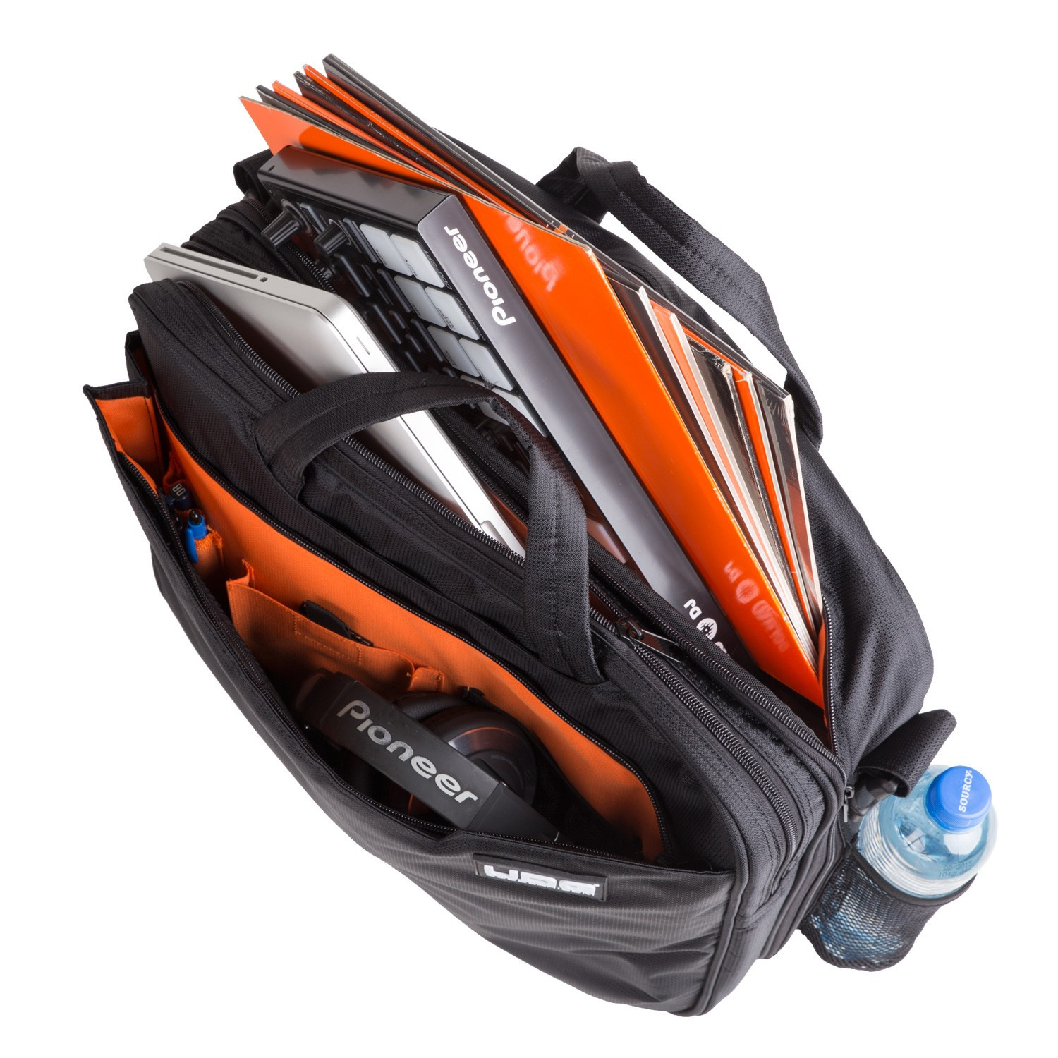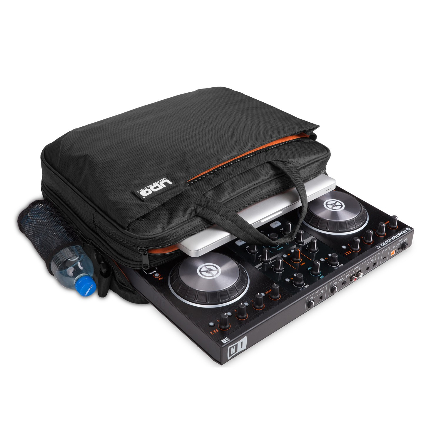 A compact design for professional DJ's that use a Digital DJ-controller. Designed with padded main compartment for MIDI Controller, it will secure from shocks while traveling. Front compartment fits 17" laptop and quick access pocket for Accessories and smaller gear.