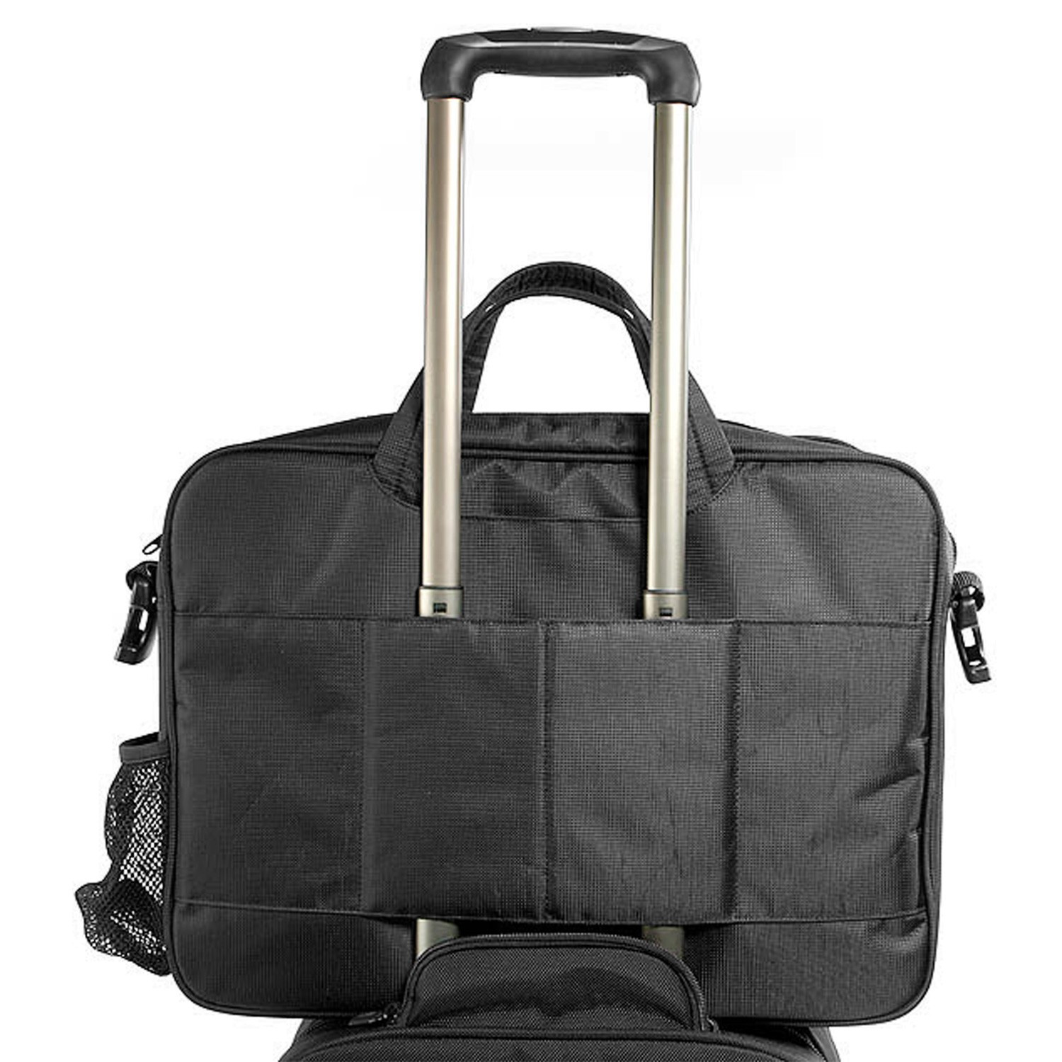 • Extra's Front compartment for Accessories. Side mesh pocket for water bottle. Ergonomic removable shoulder strap. Top carry handles. Slides over any trolley.