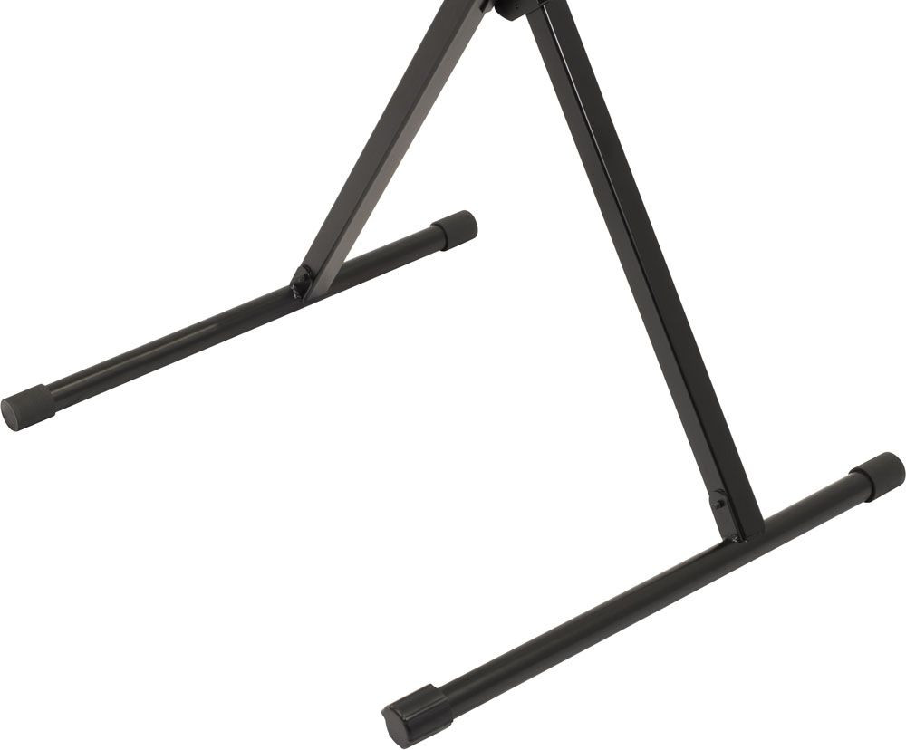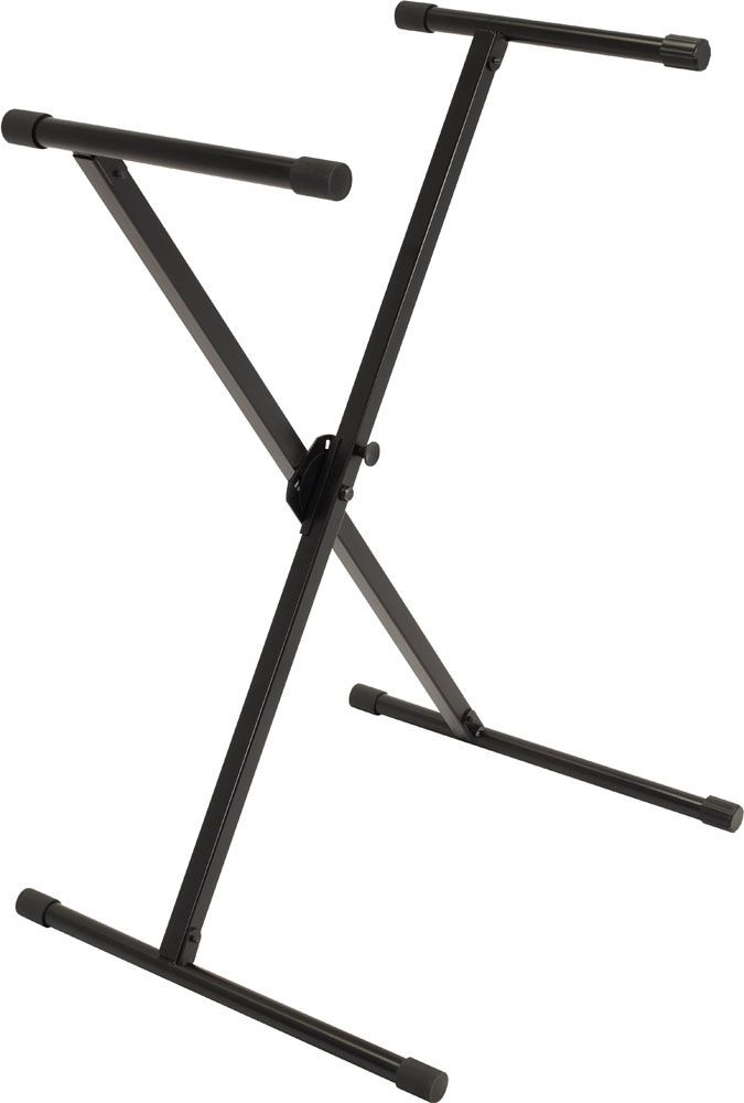 The IQ-X-1000 is an X-style keyboard stand with a patented memory lock system, five height settings, stabilizing end caps, and single-braced tubing. Holds approx. 100 lbs distributed weight.