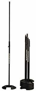 Weighted base mic stand with stackable base that allows up to six stands to be stacked in the footprint of one.