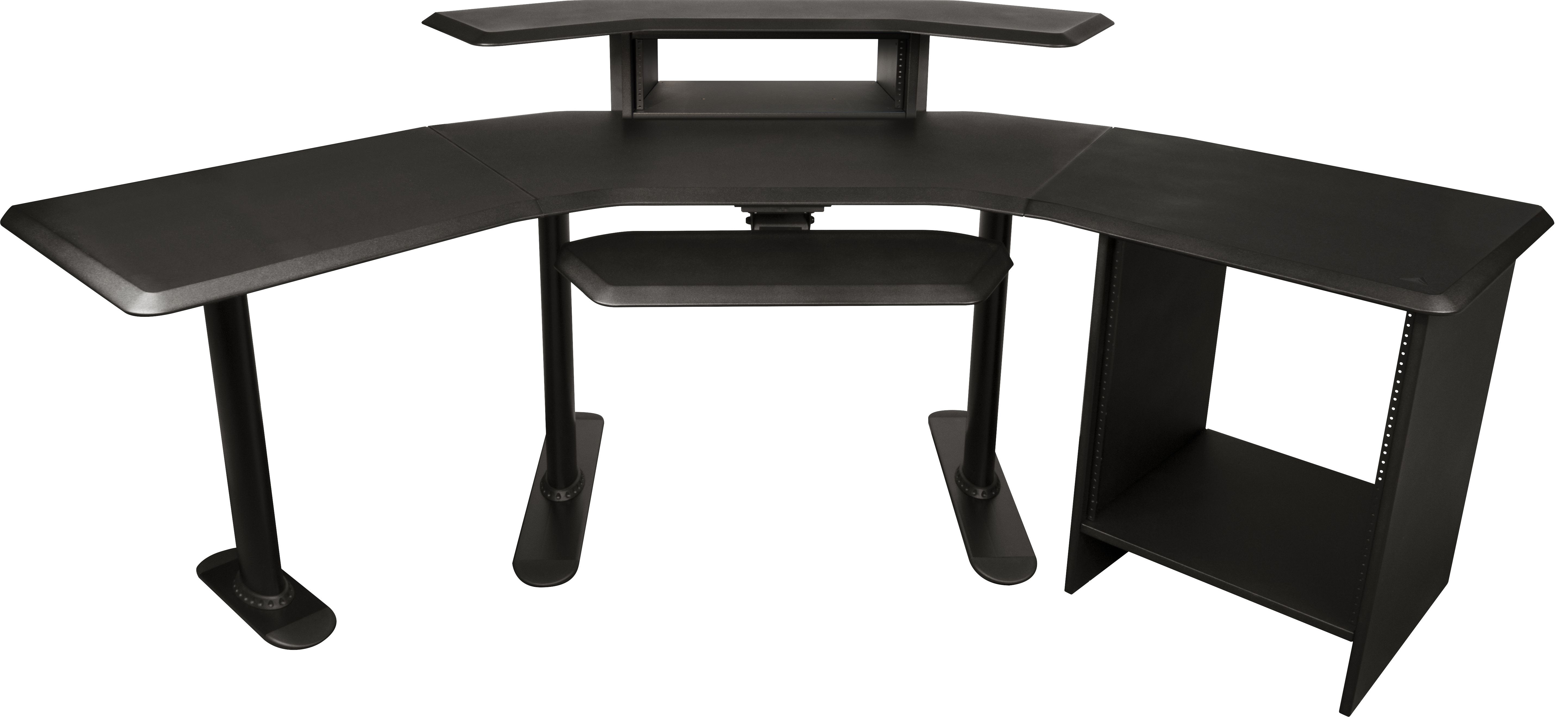 Nucleus Series - Studio Desk - Base model, 24" extension, 12 space rack, 2nd Tier, 4 space rack, Keyboard Tray. The Nucleus 4 is the fully expanded model, and includes a single 24" extension on the left side, a 12 space rack cabinet on the right, the Nucleus Second Tier, additional 4 space rack unit, and a Keyboard Tray.