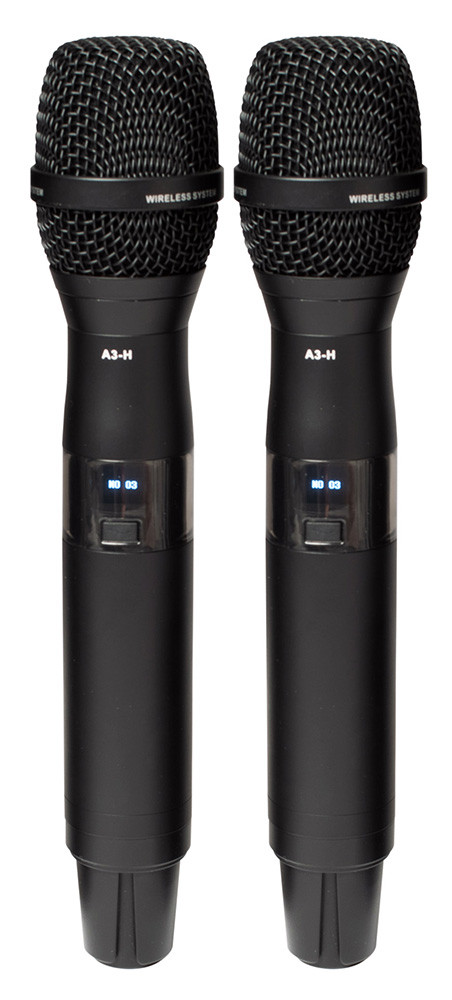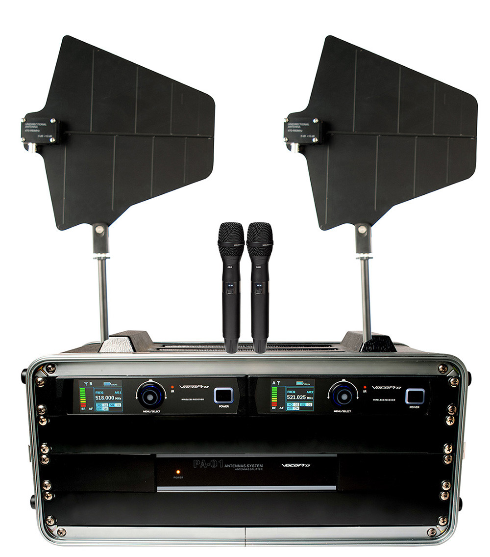 The system consists of true diversity receivers, handheld microphone or body pack transmitter, antenna distribution system and two active directional antennas. Packaged in a flight case and including floor stands for the antennas.