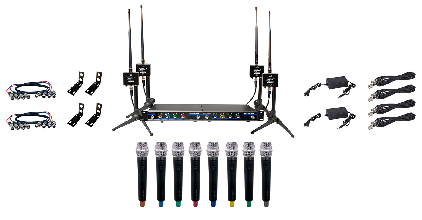The Vocopro Boost-Acapella-8 is a 600t. long-range digital wireless microphone package with handheld transmitters. It includes an eight microphone set with antenna booster package.