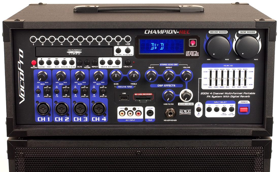 Whether you are a traveling musician on the road, a vocalist that needs to do a gig, or an aspiring singer who wants to practice at home, finding an easy way to record your performances is a necessity. Recognizing this, we took our top-performing mini-concert system and added a super easy to use SD recorder to create a mini-concert recording system. We introduce the CHAMPION-REC!
