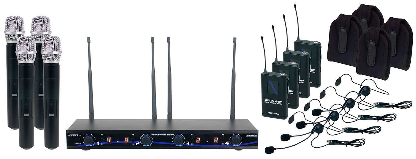 Have the urge for your band to go wireless but a decent wireless system is just too expensive? Check out VocoPro's new DIGITAL-31,32,34-ultra systems. This fully digital wireless system, operating in the future proof 900 MHz range, has everything you need to go completely wireless. An all inclusive package featuring: handheld microphone(s) and wireless bodypack(s) with headset mic and instrument cable. VocoPro is the industry's first to package a single receiver with multiple transmitters offering ultimate flexibility and affordability. This is also a super affordable system thanks to new, mic -on-chip(tm), technology we were able to eliminate hundreds of parts as well as hours of manual adjusting by implementing a single IC design. Pick up a digital-ultra single, dual or quad system for your band and perform with the freedom of wireless.