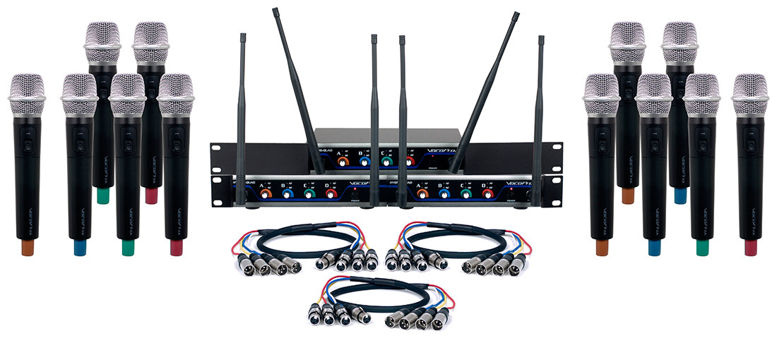 The Vocopro DIGITAL-ACAPELLA-12 is a 12 channel UHF wireless handheld microphone system. Includes 12 wireless handheld microphones, three DIGITAL-QUAD-H, and tthree XLR-QUAD-6.