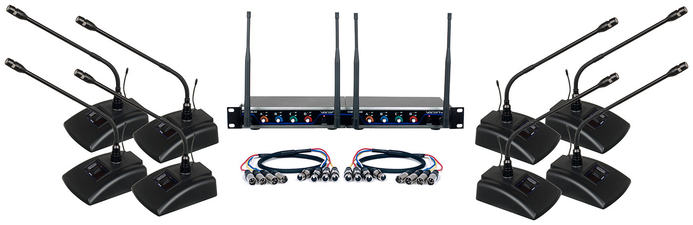 The Vocopro Digital-Conference-8 is an 8 channel UHF wireless headset/lapel microphone system. Includes 8 conference microphones, and two XLR-QUAD-6.