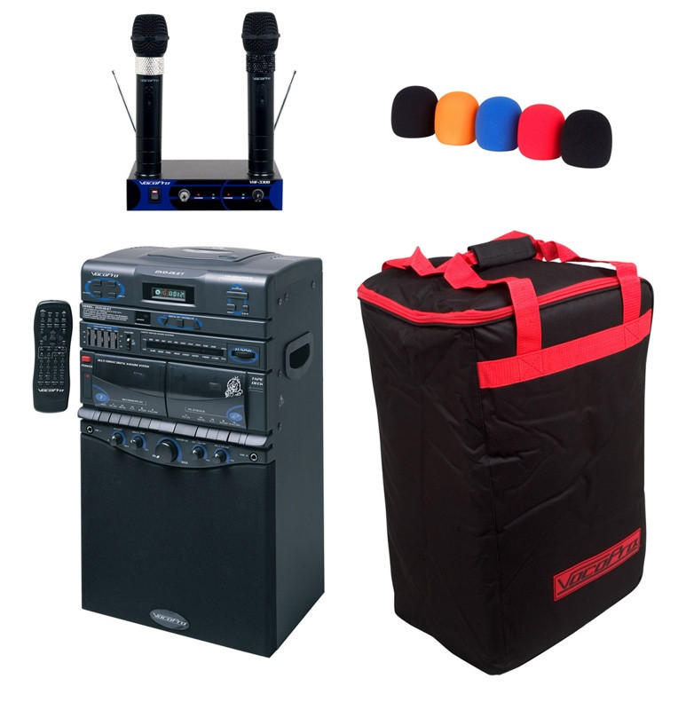 The DVD-DUET PRO II extends the at-home workhorse DVD-DUET into a take along party system. Simply pack it all up in the road-worthy carrying bag and you are good to go. The VHF-3308's crystal studded wireless microphones add some bling, while the included windscreens add some forgiveness to less-than-stellar mic technique. Take along the DVD-DUET PRO II to your next event, and get the party started!