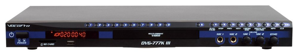 The DVG-777K III is a full featured multi-format karaoke and DVD player. With enhanced USB and SD card capabilities, you can easily access your digital music and video both at home and on the go. The DVG-777K III has been updated and now supports MP3+G!