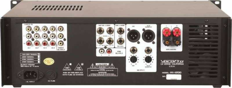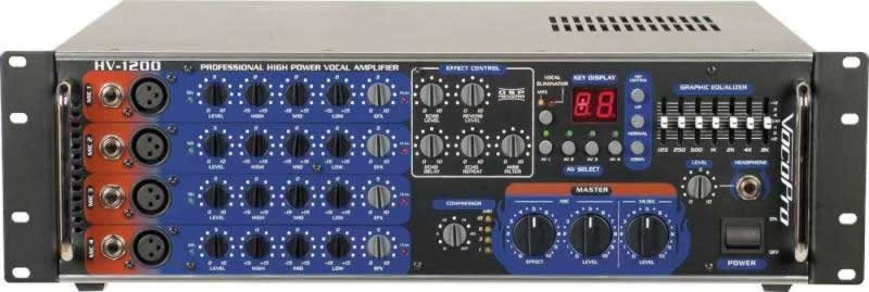 VocoPro had many requests from club KJs for a solid P.A.- style mixing amplifier. Our answer is the HV-1200, a true high power PA vocal mixing amplifier. The HV-1200 utilizes our proven VP-600 PRO power amplifier designed with five-way protection circuitry, making this a high power workhorse. It's also a first class mixer using VocoPro's own DSP Echo / Reverb board for the highest standard in vocal effects. There is even a built in compressor to prevent distortion from excessive vocals on all microphone channels. So if you work hard for your gig, why not get an amplifier that will work as hard as you.