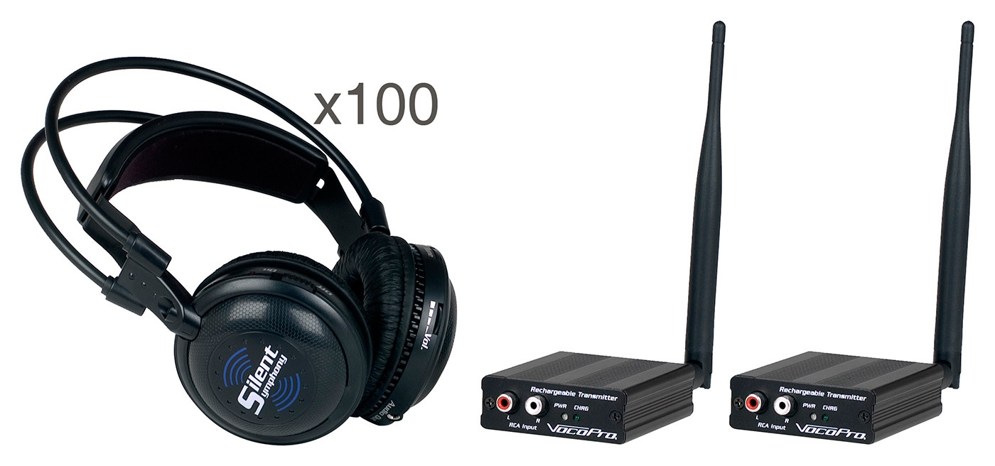 Vocopro's Silent Symphony Disco Package is an all-in-one wireless headphone system perfect for silent parties. The 2 wireless transmitters allow you to either extend the range of reach, or transmit two separate programs, allowing users to choose what they listen to.