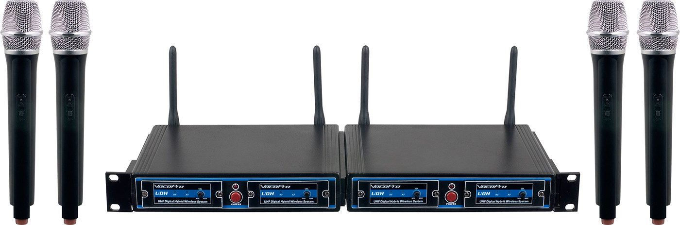Technology for wireless microphones has evolved: making professional equipment affordable for everyone. By combining our proven UHF transmission technology with a DSP chip that replaces hundreds of analog components, VocoPro's newest UDH Hybrid wireless microphone systems are the reliable choice for multiple channel applications.