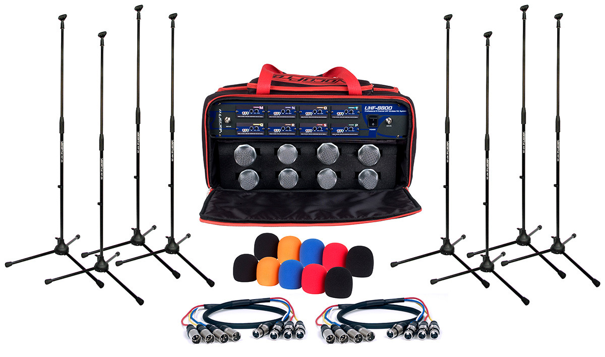 • System Includes UHF-8800 System, 2 XLR-QUAD Cables, 8 Mic Stands, Carrying Bag, 10 Mic Windscreens