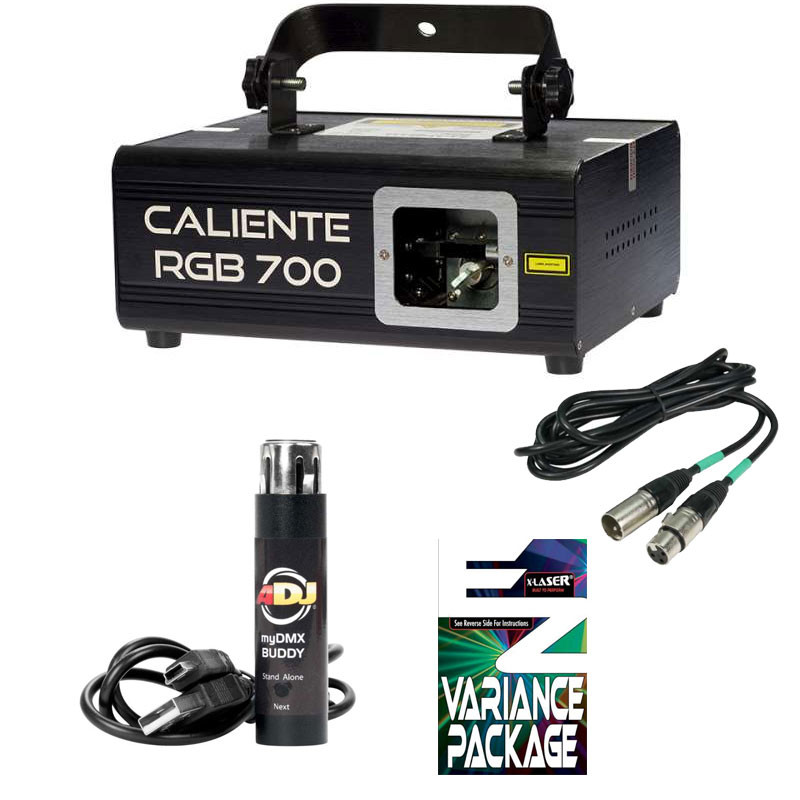 This X-Laser laser package includes (1) Caliente 700 high-output laser, (1) ADJ MyDMX Buddy USB/DMX Dongle & DMX Software, (1) X-Laser EZ Variance Kit and (1) 25ft 3-pin DMX cable.