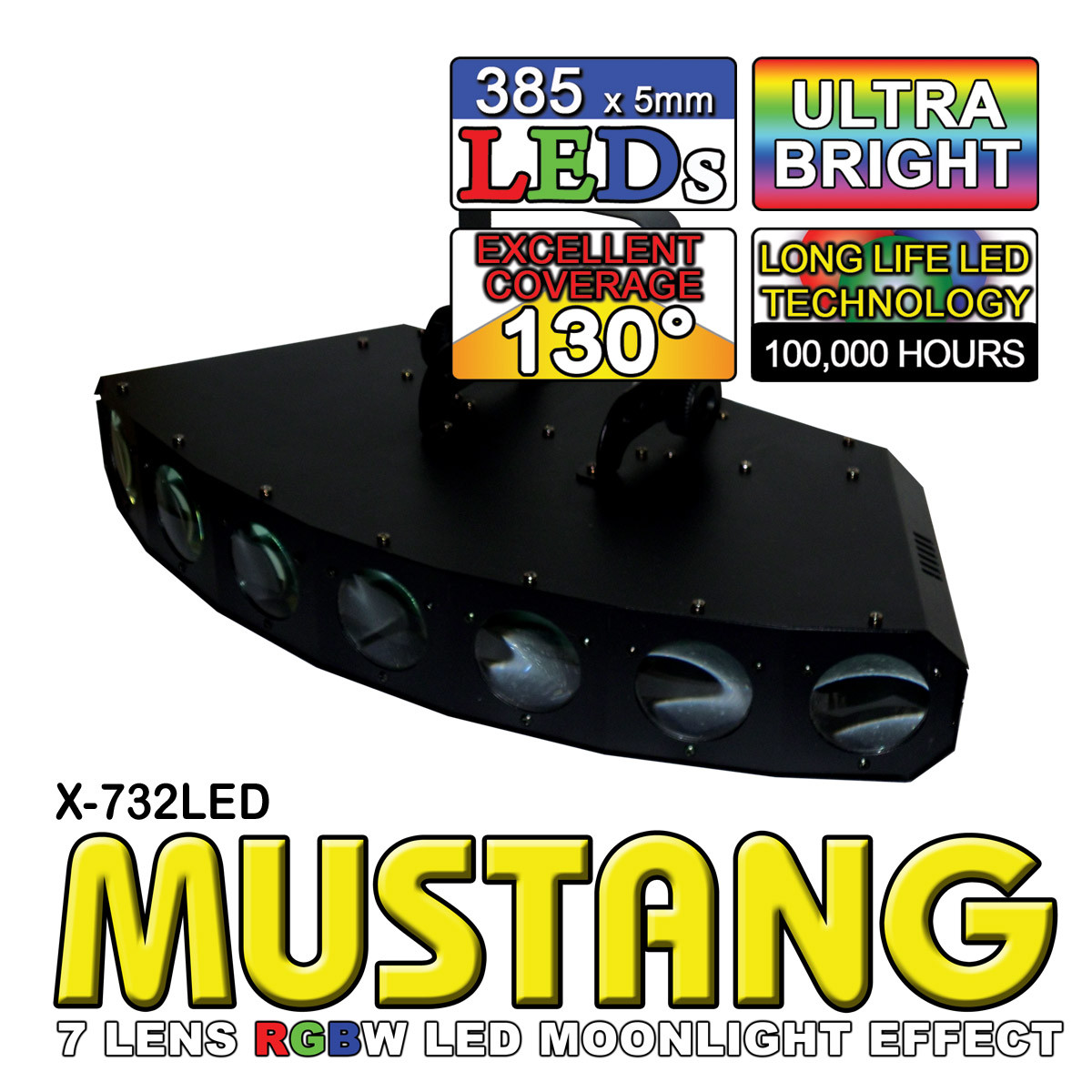 The Mustang X-732 LED is built to last with long-life LED technology (rated at 100,000 hrs), and has no moving parts inside. The unit stays cool so you can run it all night long. Plus, there's no cool down time at the end of a gig, so you can just pack it up and go!