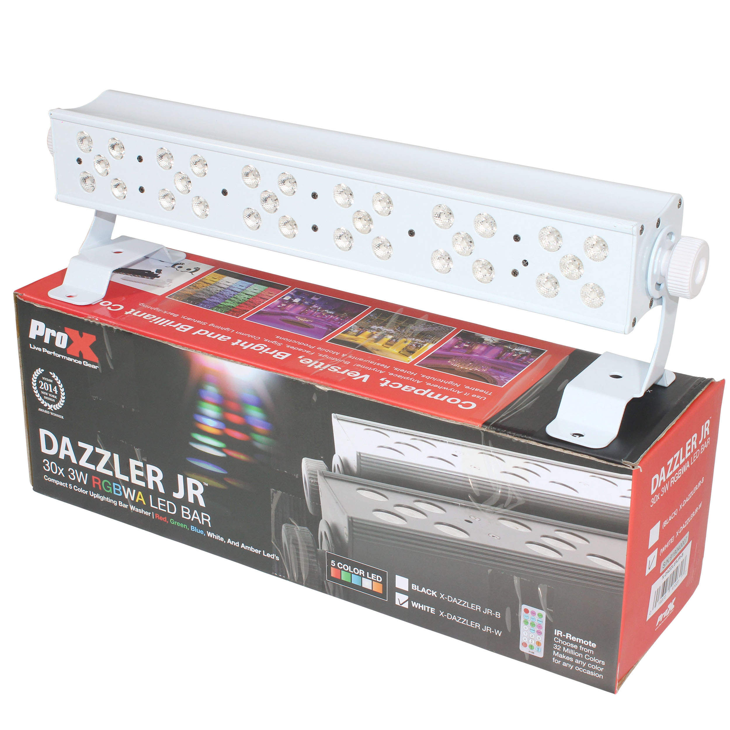 The ProX DAZZLER' JR is an RGBWA bar wash fixture powered by 30x 3W Red/Green/Blue/Amber/White LEDs (6x each). Users can produce outstanding color mixing, with up to 32 Million Colors, from its high powered RGBWA LEDs. User-selectable DMX modes and an LED control panel with IR Remote Control, makes this fixture flexible and easy to use.