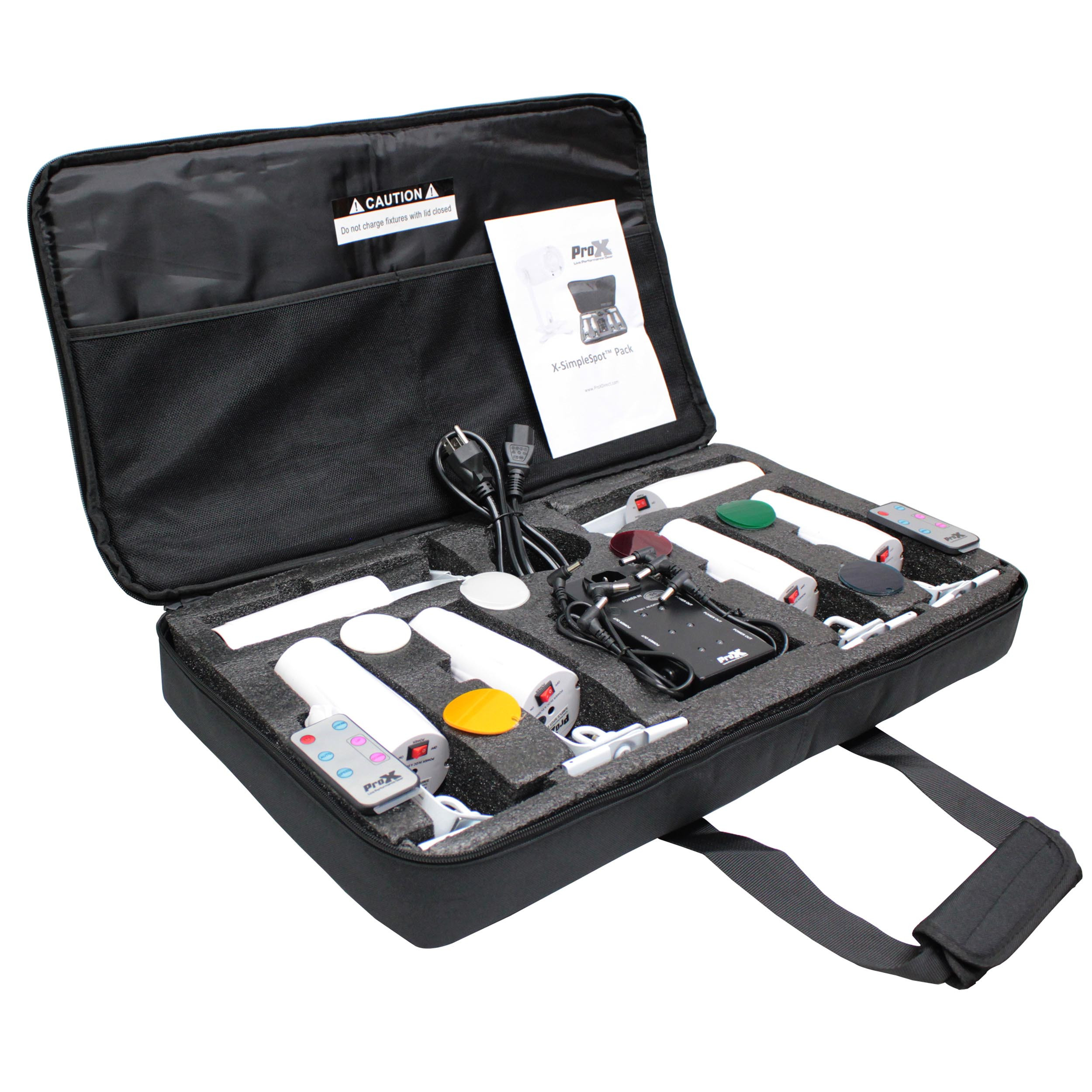 The ProX X-SimpleSpotPack is part of our high quality intelligent lighting products. The X-SimpleSpot is a bright (3 Watt), battery powered, LED pin spot. Each X-SimpleSpotPack contains 6 SimpleSpot 6000k Cool White SimpleSpot. Each unit will operate for up to 6 hours on a full charge. The 2 included IRC Remote Controls will enable On/Off, Strobe, Speed, Auto and Up/Down Dimmer. Each unit projects a cool white beam and gel filters are included for each light consisting of Red, Green, Blue, Warm White, Amber and White Frost.
